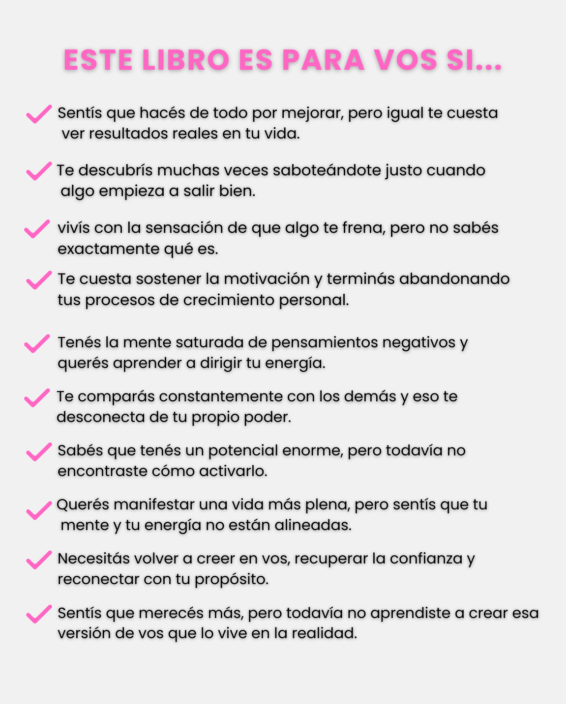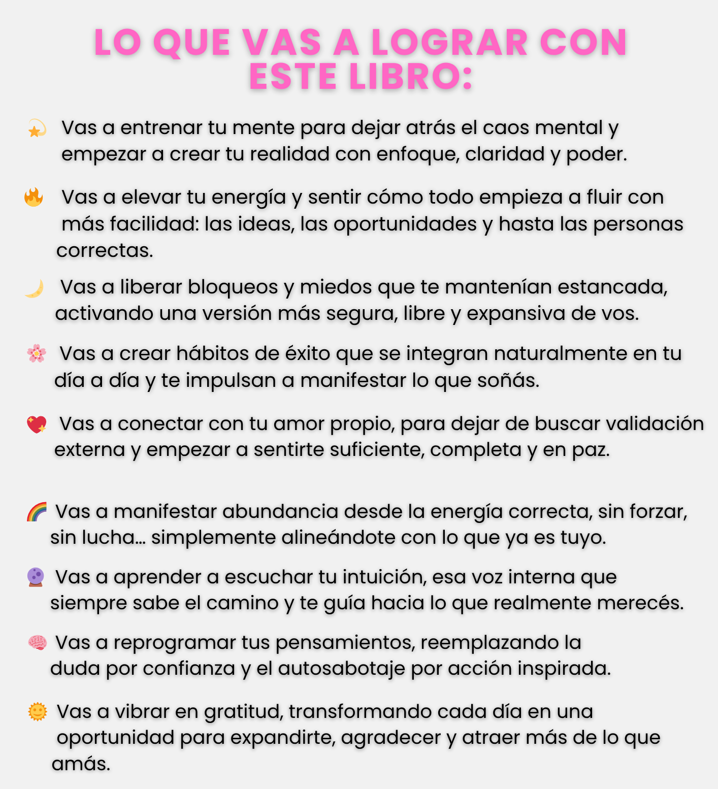 Es una guía práctica y transformadora que combina neurociencia, mentalidad, energía y hábitos conscientes. Te enseña a reprogramar tu mente, elevar tu vibración y manifestar la realidad que deseás en solo 10 minutos por día.
